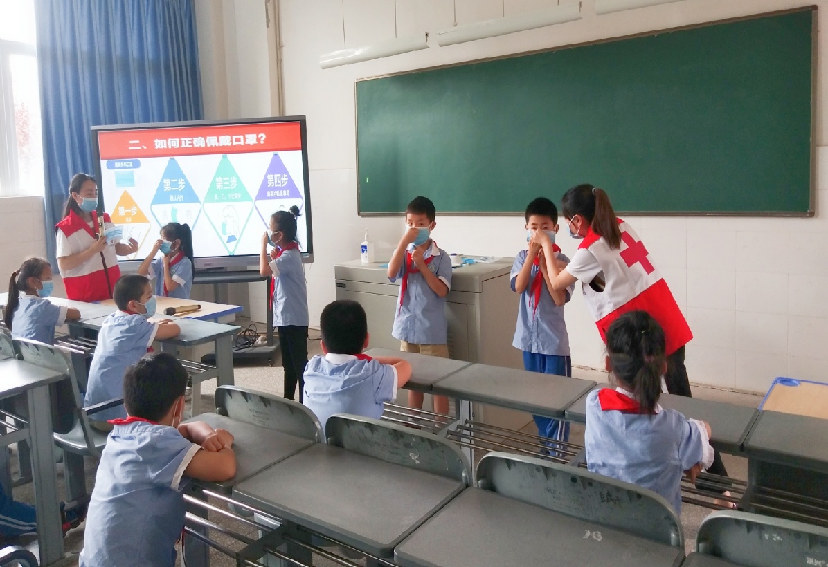 在学校的多功能教学室,该校二年级10班的师生共50多人参加了本次活动。针对开学15天,全国各地出现3例学生佩戴口罩运动发生意外的案例,志愿者寇华秀详细讲解了学生口罩的正确选择、佩戴、处置,并通过互动演示的形式让学生们懂得每天都要戴的口罩至关重要、讲究不少。志愿者黄琴现场教学了使用红外线体温测量仪和体温计测量体温的注意事项。“两个小朋友,手牵手,你背背我,我背背你。来了一只小螃蟹,小螃蟹,举起两支大钳子,大钳子。我向螃蟹点点头,点点头,螃蟹跟我握握手,握握手”通过唱诵儿歌的形式来记忆七步洗手法,边唱边洗手,让七步洗手变得简单又好玩,这是负责医院感控的志愿者杨甜甜带给同学们的洗手操。