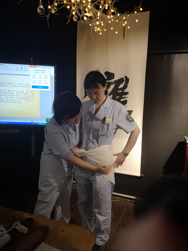 这次的主讲是张林玲医生,对常见的外科外伤疾病;骨折,扭伤,血肿,烧烫伤,蜂蛰伤,气道异物阻塞等待做了详细的应对方法的讲解。讲到海姆力克操作法应对气道异物阻塞时,气氛热烈起来,学员们两人一组,开始操作。张医生和阎医也结合实际开始了海姆力克操作法,手腕骨折,骨盆骨折,搬运脊椎骨折病人的操作解析,并对每一个学员的操作出现问题进行了纠正。
