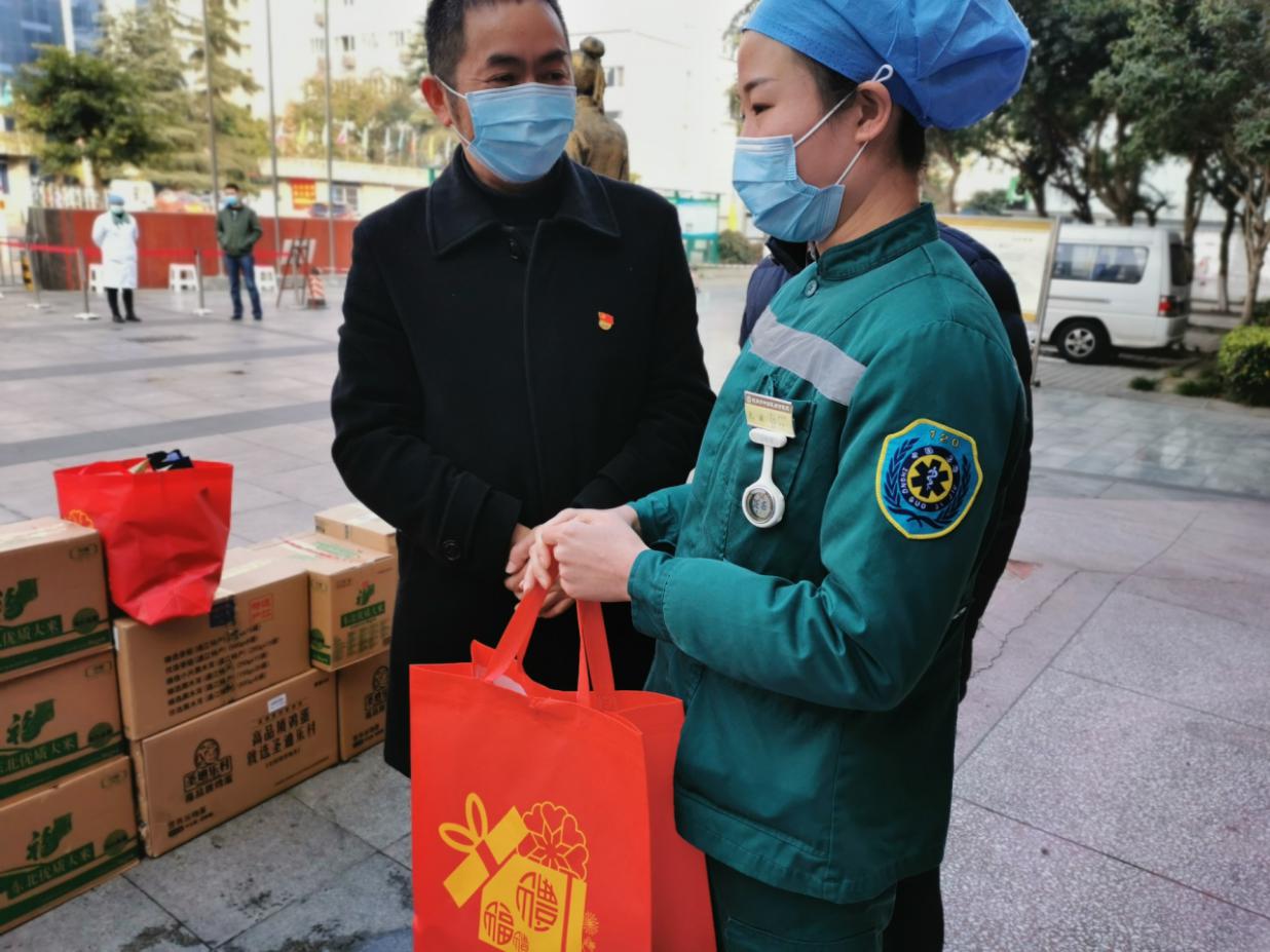 2月21日,德阳市总工会党组成员、副主席范爱民、德阳市科协党组成员、副主席何勇、德阳市政府妇儿工委办主任蔡世春一行来到我院,关心慰问坚守疫情防控一线医务人员。我院领导班子及行政职能科室负责人陪同。