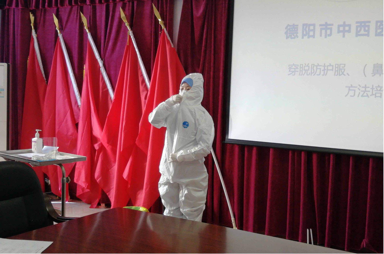 2020年3月10日下午,医院护理部、院感科再次组织各科室护理操作带教老师进行了穿脱防护服、(鼻)咽拭子采集的操作培训。急诊科护士王程程、治未病科护士长黄和蓉分别对防护服的穿脱、(鼻)咽拭子采集进行示教。德阳市精卫中心护理部、医务科、院感科相关负责人及我院各科部分护理人员参加培训。