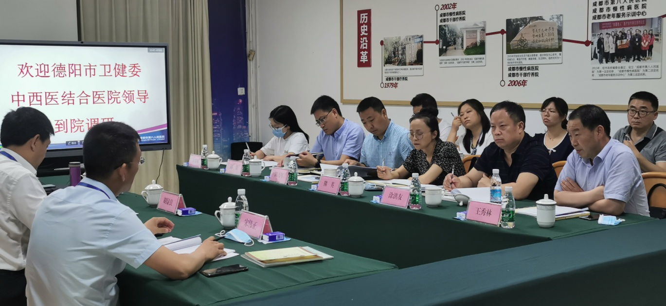 为进一步创新医养结合工作、促进医院高质量发展,2020年6月10日下午,在市卫健委党委委员、市保健办专职副主任熊英带领下,市卫健委预防保健与老龄服务科科长涂洪友及工作人员、陈万军院长及医院行政管理团队部分成员及医养结合科室骨干一行11人赴成都市第八人民医院考察学习医养结合等方面的先进经验,受到了该院院长胡显良等院领导和相关科室负责人的热情接待。