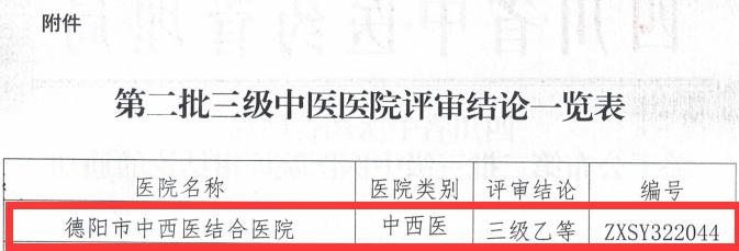 新年伊始,喜讯频传。2月1日,四川省中医药管理局公布了经国家中医药管理局统一备案的德阳市中西医结合医院等4家三级中医医院评审结论及其编号,我院位列其中,成功晋级三级乙等中西医结合医院。这标志着我院的发展实现了历史性的跨越,跃上了一个新的台阶,迎来了一个新的发展契机。这是医院继获省文明单位和全国“敬老文明号”荣誉称号后的又一座重要里程碑,是全体中西医结合人智慧和汗水的结晶。