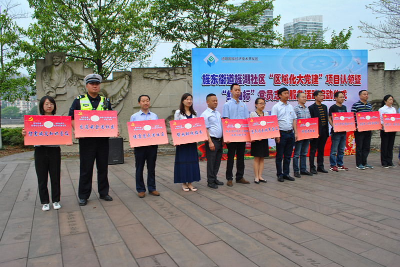 为进一步深入贯彻落实党的十九大精神,充分发挥党组织和在职党员在服务社区、服务群众中的战斗堡垒和先锋模范作用,4月23日上午,旌东街道旌湖社区“区域化大党建”项目认领暨“红袖标”党员志愿服务活动启动仪式成功举行,作为旌湖社区辖区内的一员,我院积极派出5名党员志愿者参加活动。