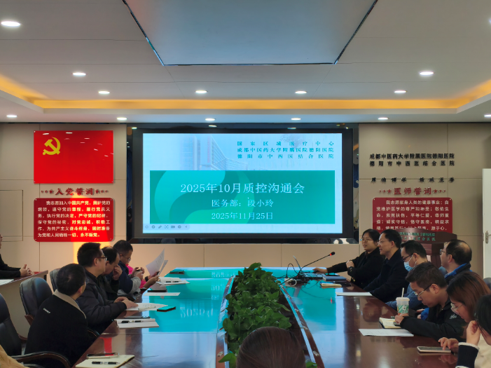 11月25日下午,成都中医药大学附属医院德阳医院在门诊楼5楼会议室召开2025年11月医疗质控会。会议由医务部组织,院领导、各科室负责人及相关质控人员参会,围绕11月份医疗质量管理工作进行全面总结与问题剖析,并部署下一阶段重点任务。
