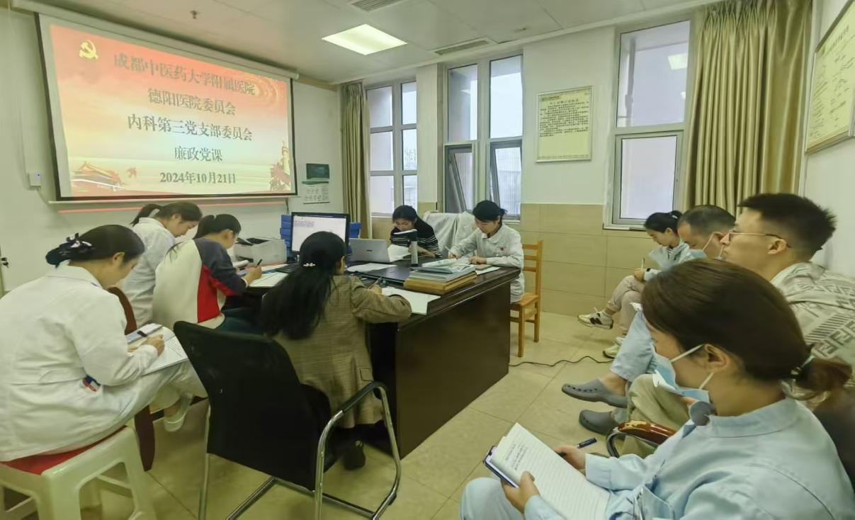10月21日,内科第三党支部在二住院楼6楼ICU办公室开展“坚持从严治党走好赶考之路”廉政党课主题党日活动,活动由支部书记谢娟主持,院党委委员寇华秀、支部全体党员及入党积极分子参加会议。