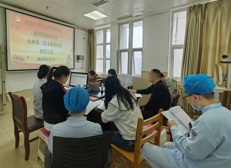 4月7日,内科第三党支部召开党员大会。会议由党支部书记谢娟主持,全体党员、预备党员及入党积极分子参会。会上,谢娟领学了《2024年政府工作报告》,党支部委员徐圣平传达了《关于对三起违反过紧日子要求典型问题的通报》文件精神,参会人员进行交流讨论。全体党员签订全面从严治党“两个责任”承诺书谢娟强调,党员同志要加强党性修养,牢固树立正确的权力观、地位观和利益观,克己慎行,廉洁奉公,以强烈的责任感、使命感、紧迫感推动党的事业发展,要始终坚持以人民为中心,坚持求真务实、进一步密切党同人民群众的血肉联系,为胜利推进强国建设、民