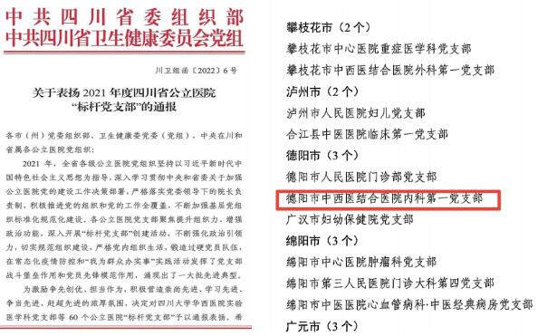 近日,中共四川省委组织部和中共四川省卫生健康委员会党组联合发文,通报表扬2021年度四川省公立医院标杆党支部,全省共有60个公立医院党支部获此殊荣,我院内科第一党支部位列其中,是德阳市入选的3个党支部之一。我院内科第一党支部由呼吸内科、急诊科、发热门诊等科室组成,现有党员12名。支部全体党员以党建引领业务发展,在疫情防控、志愿服务、结对帮扶、学科建设等方面充分发挥党支部的战斗堡垒作用和党员干部的模范带头作用。新冠疫情发生以来,支部党员第一时间组建疫情防控志愿者队伍,派员驰援武汉抗击疫情。院内保障门急诊、病区就诊疫情