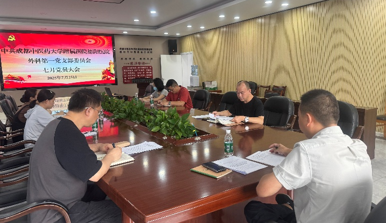 7月28日,外科第一支部在门诊五楼会议室召开7月党员大会,会议由党支部书记蒋绍剑主持,全体党员参加会议。